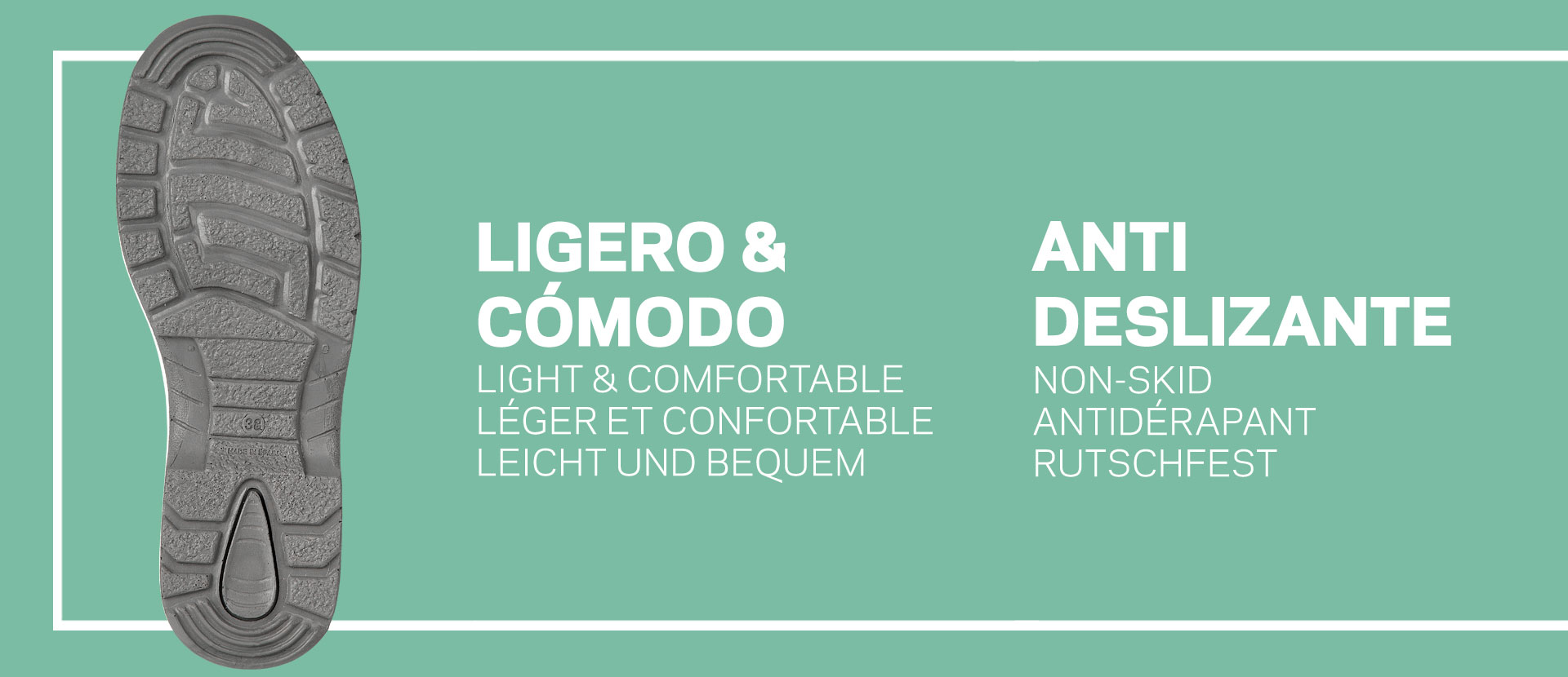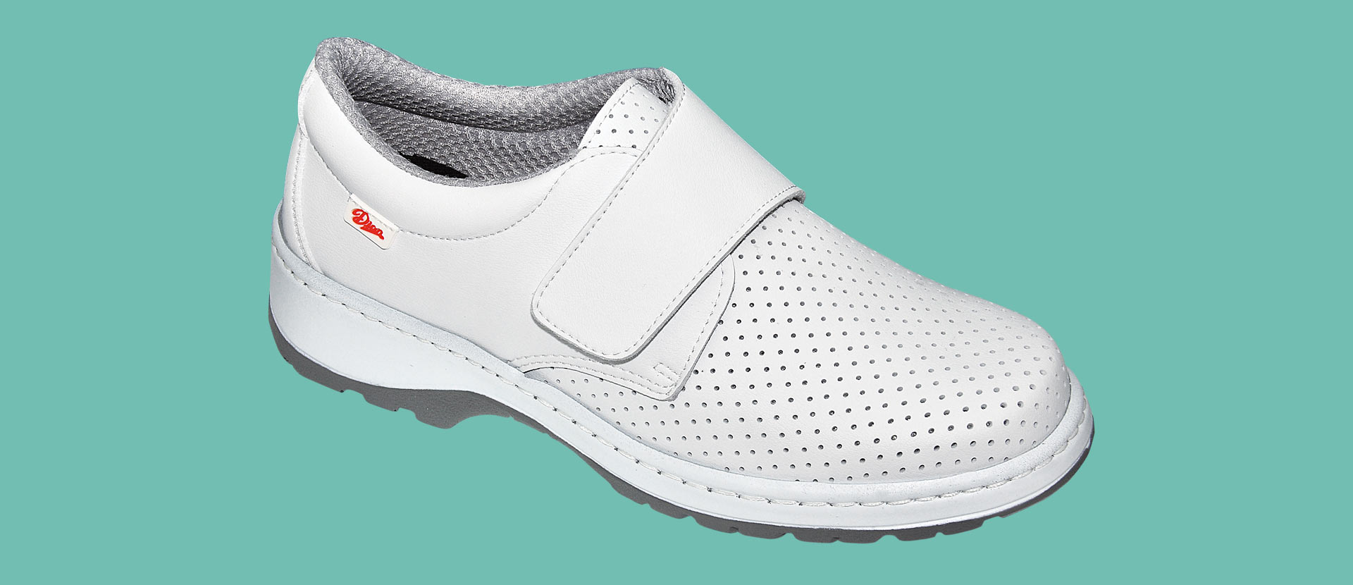 Zapato con cierre de velcro, lavable en frío y caliente hasta 40º, corte de microfibra D’COVER OEKO-TEX® forrada interiormente D’DRY®, altamente TRANSPIRABLE con gran capacidad de absorción de humedad y rápido secado. Horma recta de puntera redondeada. Contrafuerte de dureza suficiente para sujetar el calcáneo. Plantilla acolchada de tejido sobre espuma de poliuretano con tratamiento antibacterias y carbón activado. Suela antibacteriana de poliuretano bicolor, antideslizante de gran coeficiente en seco y húmedo, con resaltes acanalados en la suela para facilitar la evacuación de líquidos. Fabricado mediante montado y cosido de seguridad para reforzar la unión de la suela al corte del zapato.