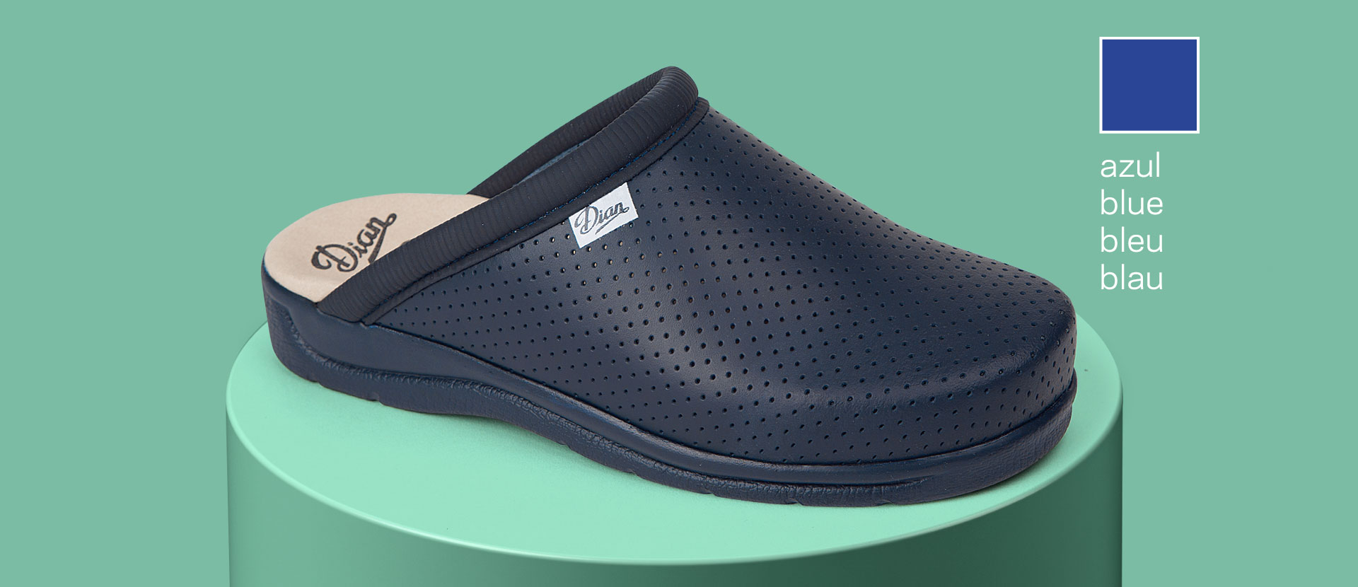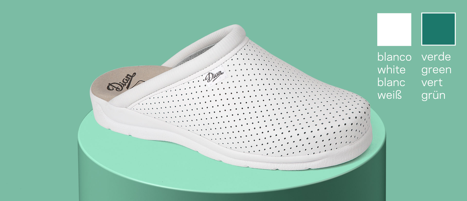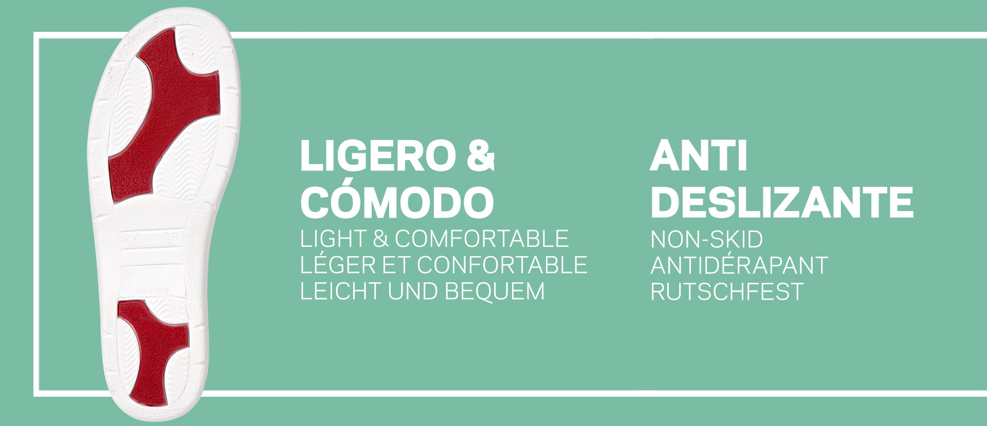 Zueco de microfibra técnica D’COVER OEKO-TEX® perforada con acolchado en el empeine para evitar rozaduras, montado sobre horma recta de puntera redondeada. Plantilla anatómica forrada en microfibra técnica con barra metatarsal. Suela antibacteriana de poliuretano en forma de cuña, antideslizante de doble densidad, bicomponente de poliuretano y TPU combinados para aumentar el coeficiente de eficacia antideslizante del zueco.